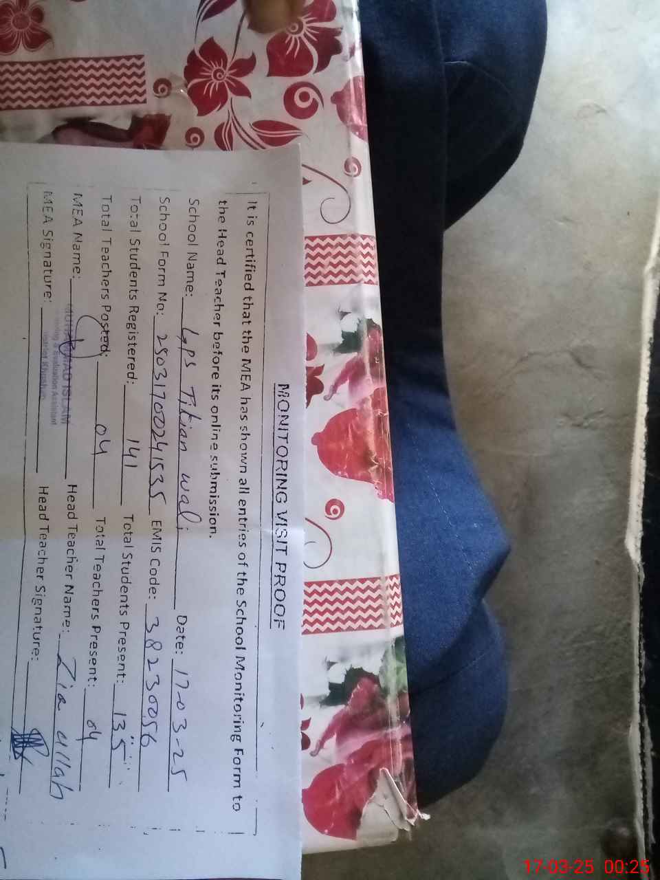 | Attendance Register | Head Teacher | MEA with School | Visit Proof |