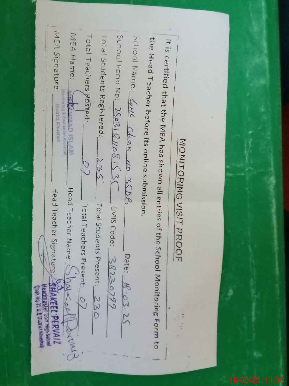 | Attendance Register | Head Teacher | MEA with School | Visit Proof |