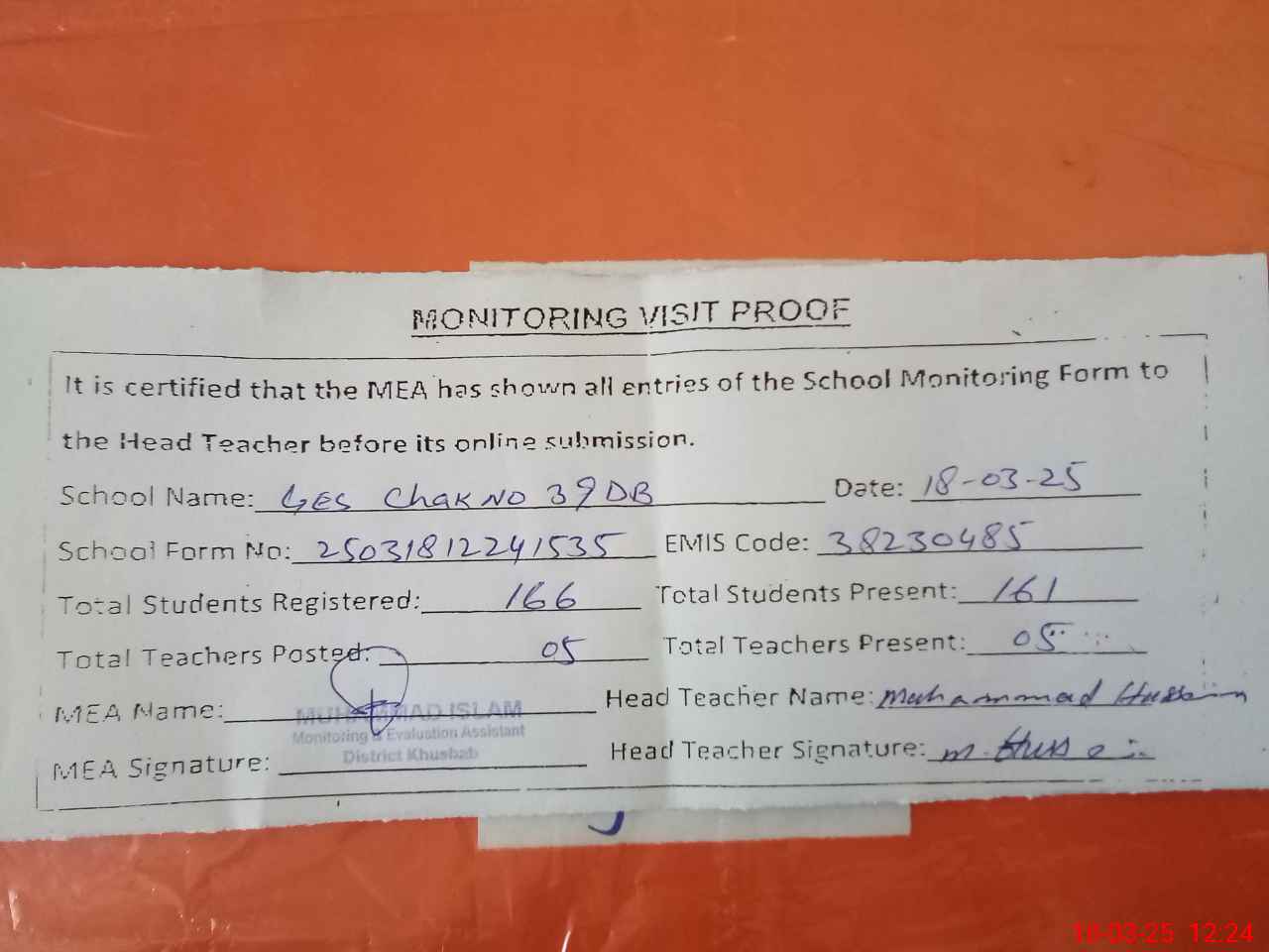 | Attendance Register | Head Teacher | MEA with School | Visit Proof |