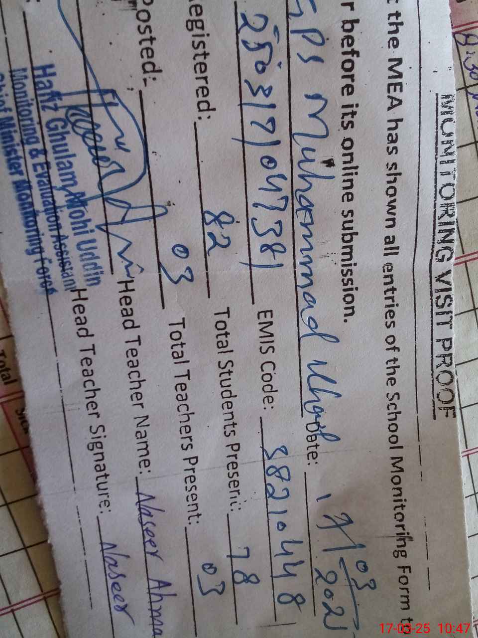| Attendance Register | Head Teacher | MEA with School | Visit Proof |