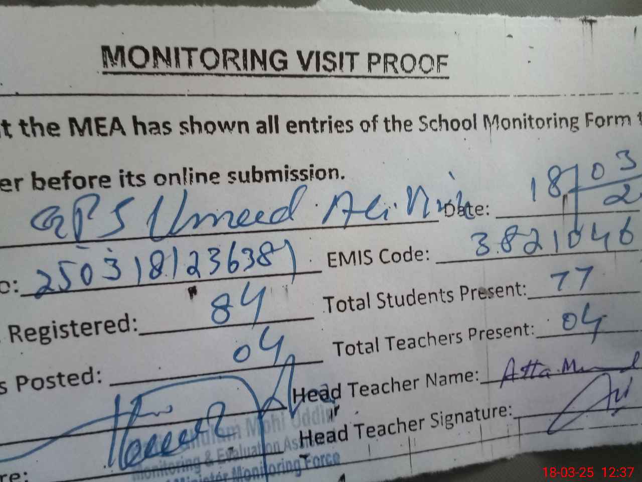 | EMIS Code: 38210461 | Name of School: GPS UMEED ALI VIRK | |||
