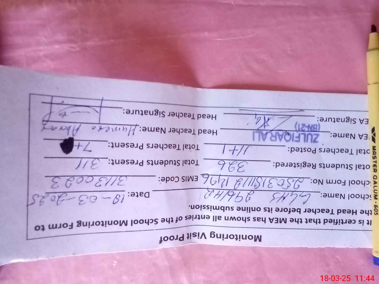 | Name: Hu**** Ab**** Designation: (School Headmaster's/Headmistress's) S.S.T. CS Phone/Cell Number: 03**** |