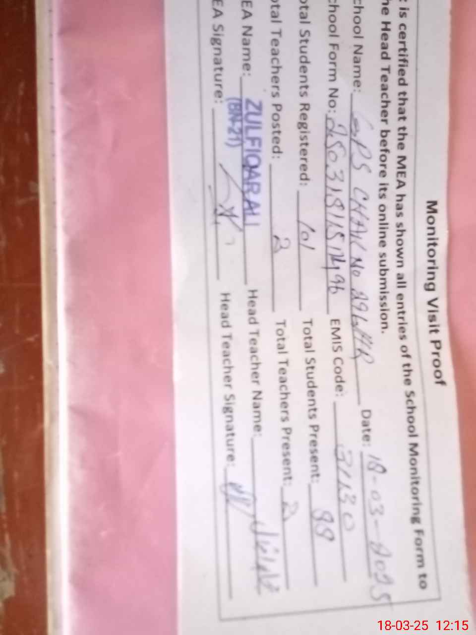 | Attendance Register | Head Teacher | MEA with School | Visit Proof |