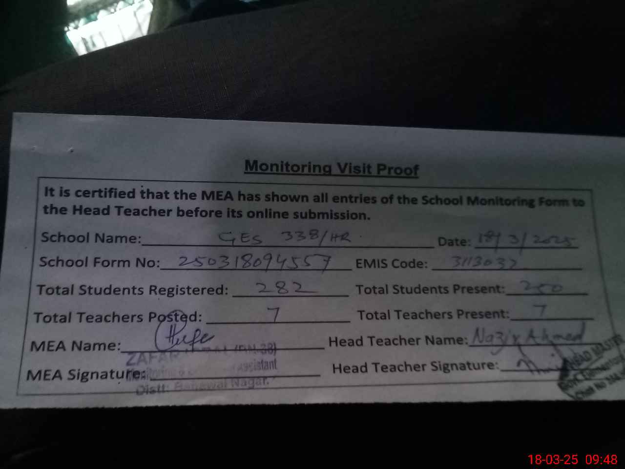 | Attendance Register | Head Teacher | MEA with School | Visit Proof |
