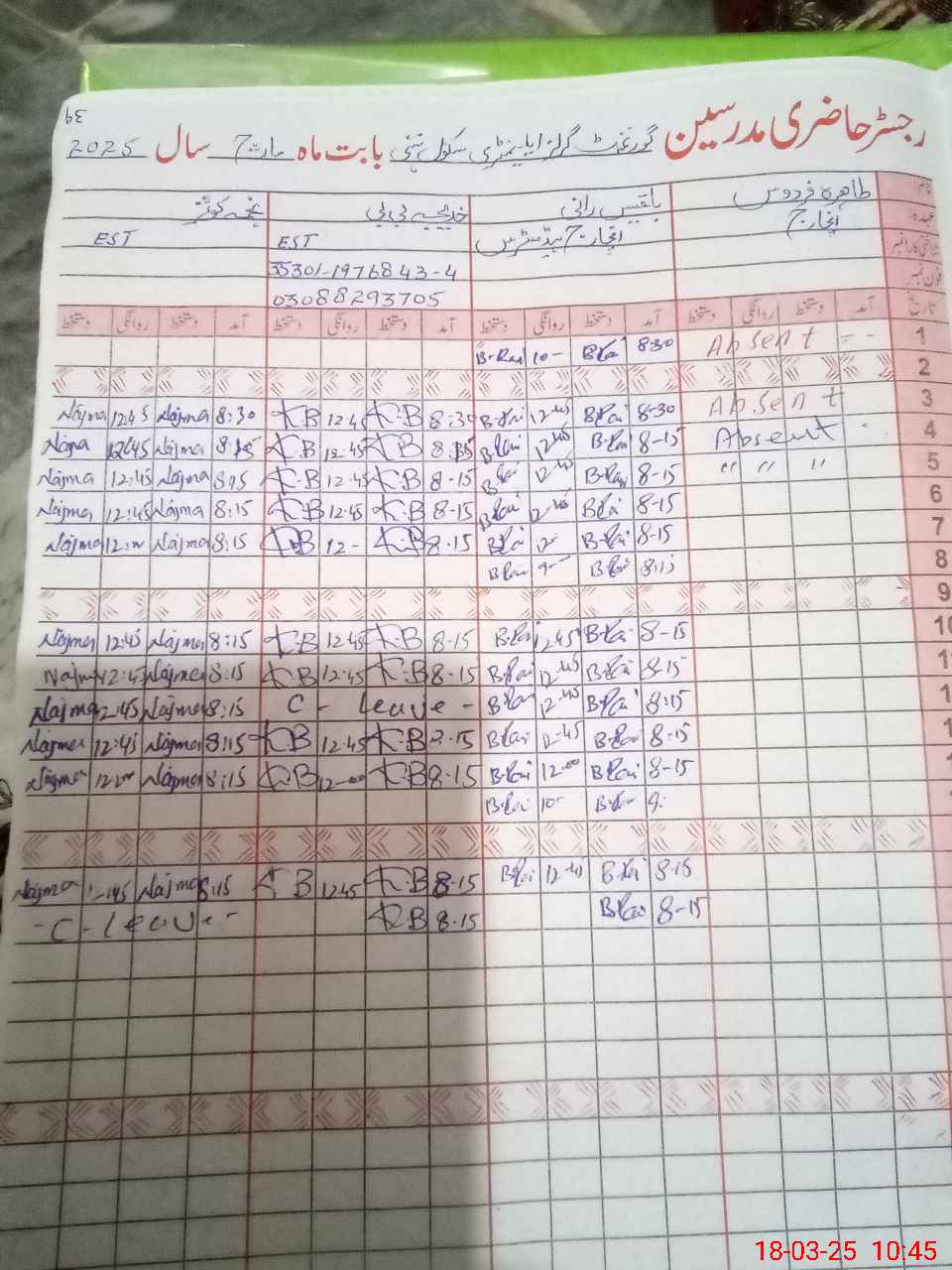 | CNIC | Full Name | Designation | R/C | Absence During Last Calender Month |