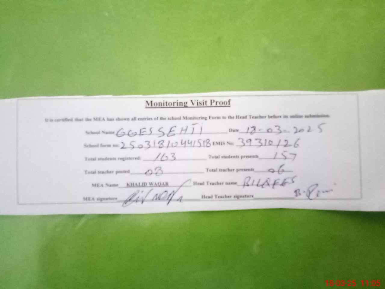 | Attendance Register | Head Teacher | MEA with School | Visit Proof |