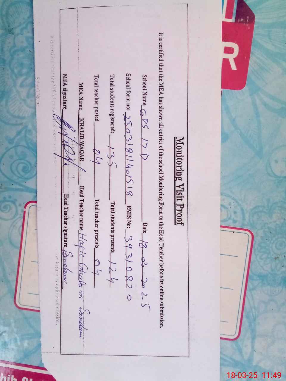 | Attendance Register | Head Teacher | MEA with School | Visit Proof |
