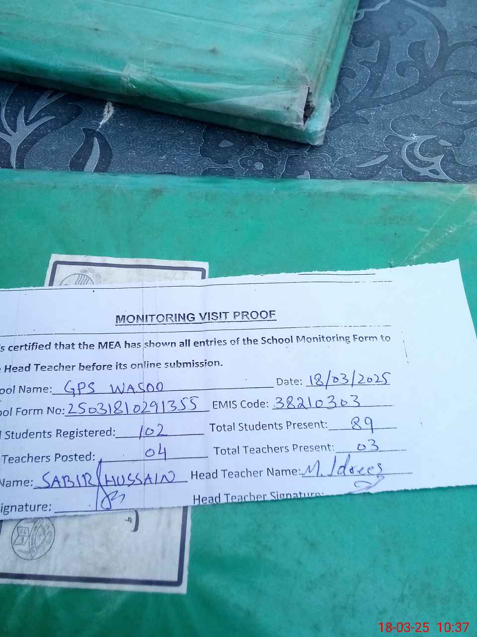 | Attendance Register | Head Teacher | MEA with School | Visit Proof |