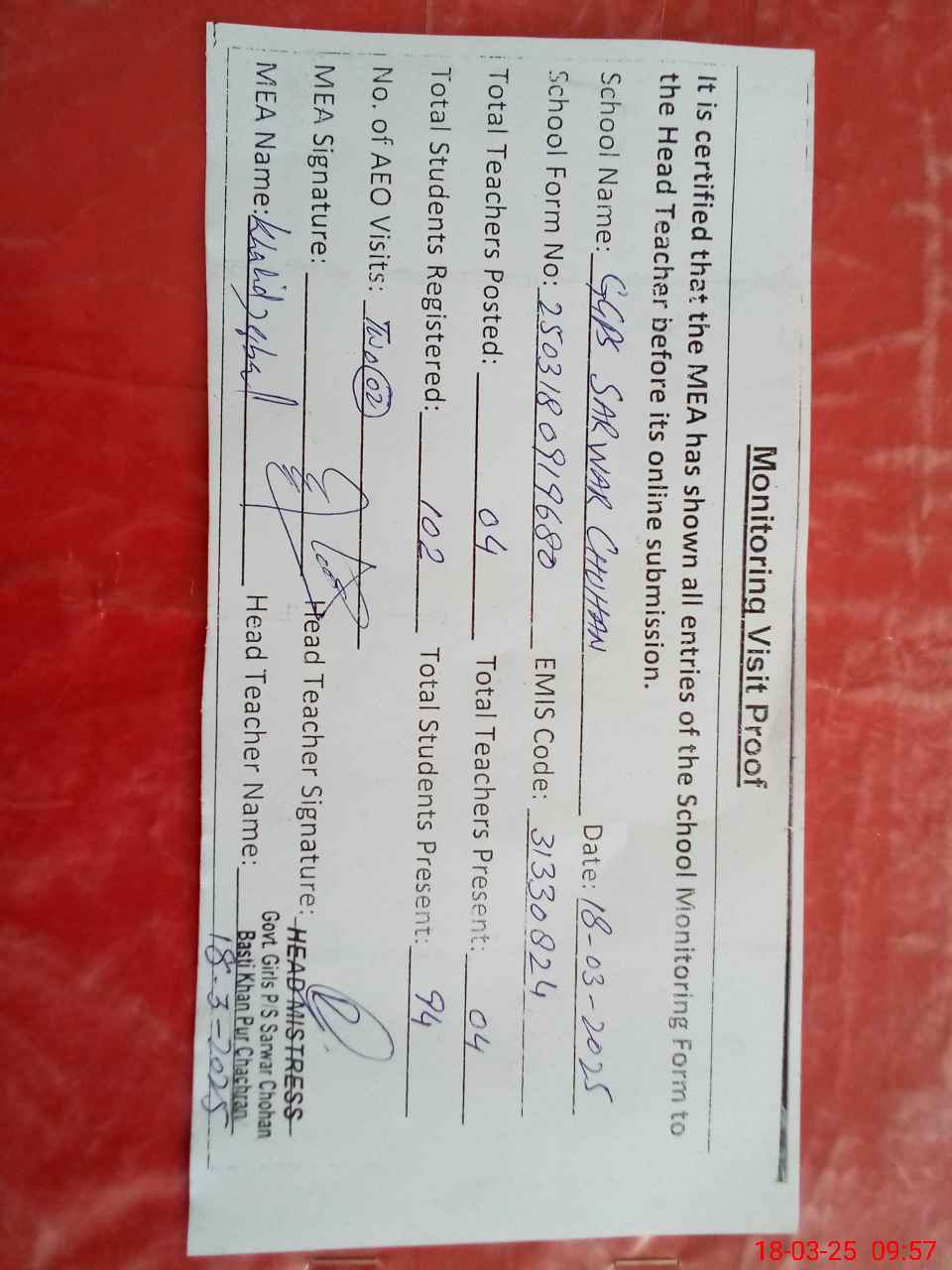 | Attendance Register | Head Teacher | MEA with School | Visit Proof |