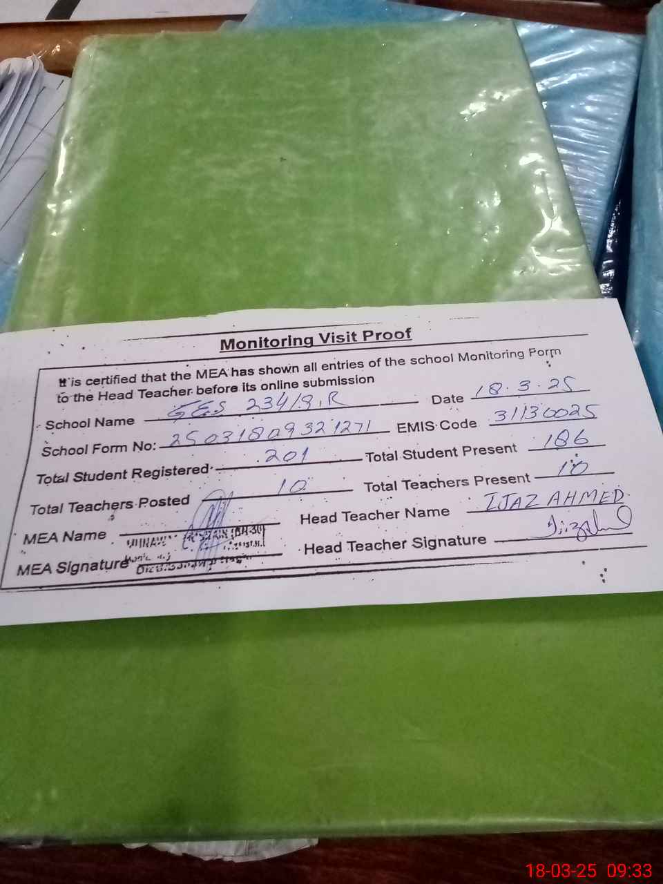 | Attendance Register | Head Teacher | MEA with School | Visit Proof |