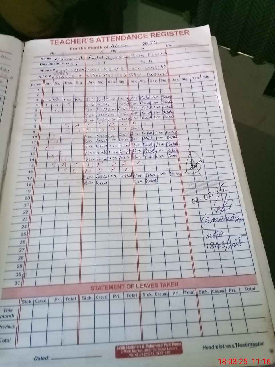 | Name: TA**** KH**** Designation: (School Headmaster's/Headmistress's) PST Phone/Cell Number: 03**** |