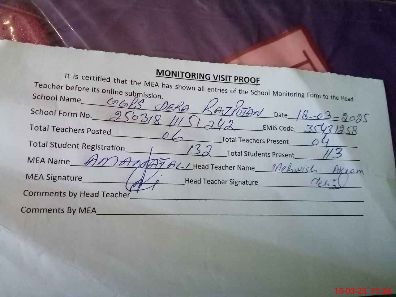 | Attendance Register | Head Teacher | MEA with School | Visit Proof |