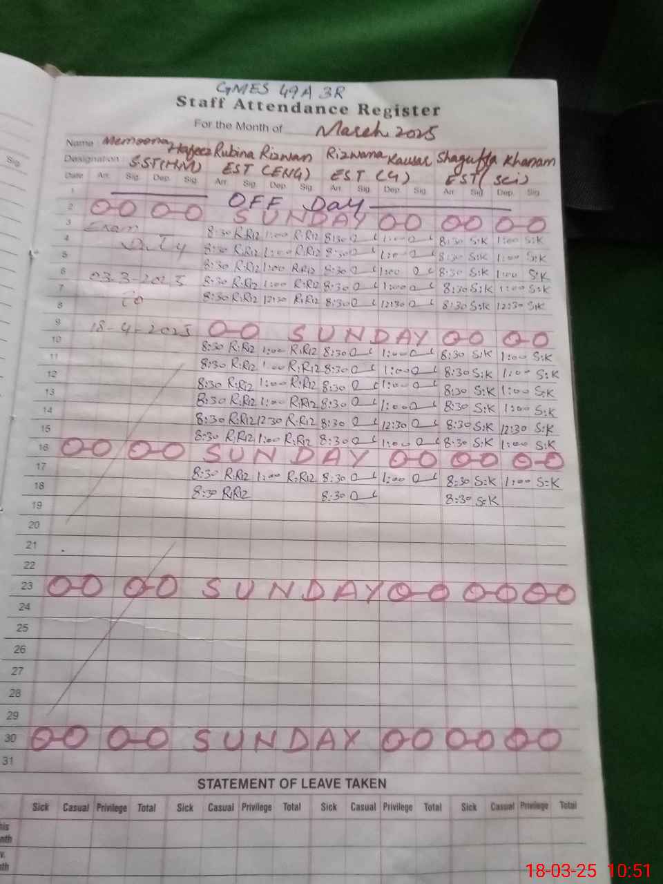 | 35**** | Me**** Ha**** | Regular | 2 | 4 | 0 | 0 | 0 | 0 | 0 | 0 | 2 | Exam Duty | |