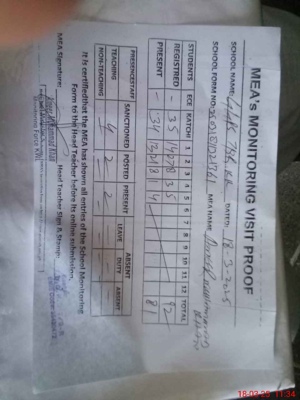 | Attendance Register | Head Teacher | MEA with School | Visit Proof |