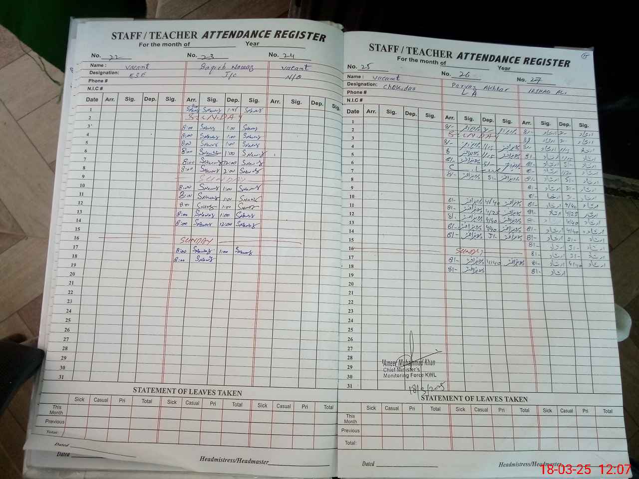 | Remarks (Use Separate Page if Required): Student attendance taken from roznamcha due to examination Physically students were not present in school | |||||