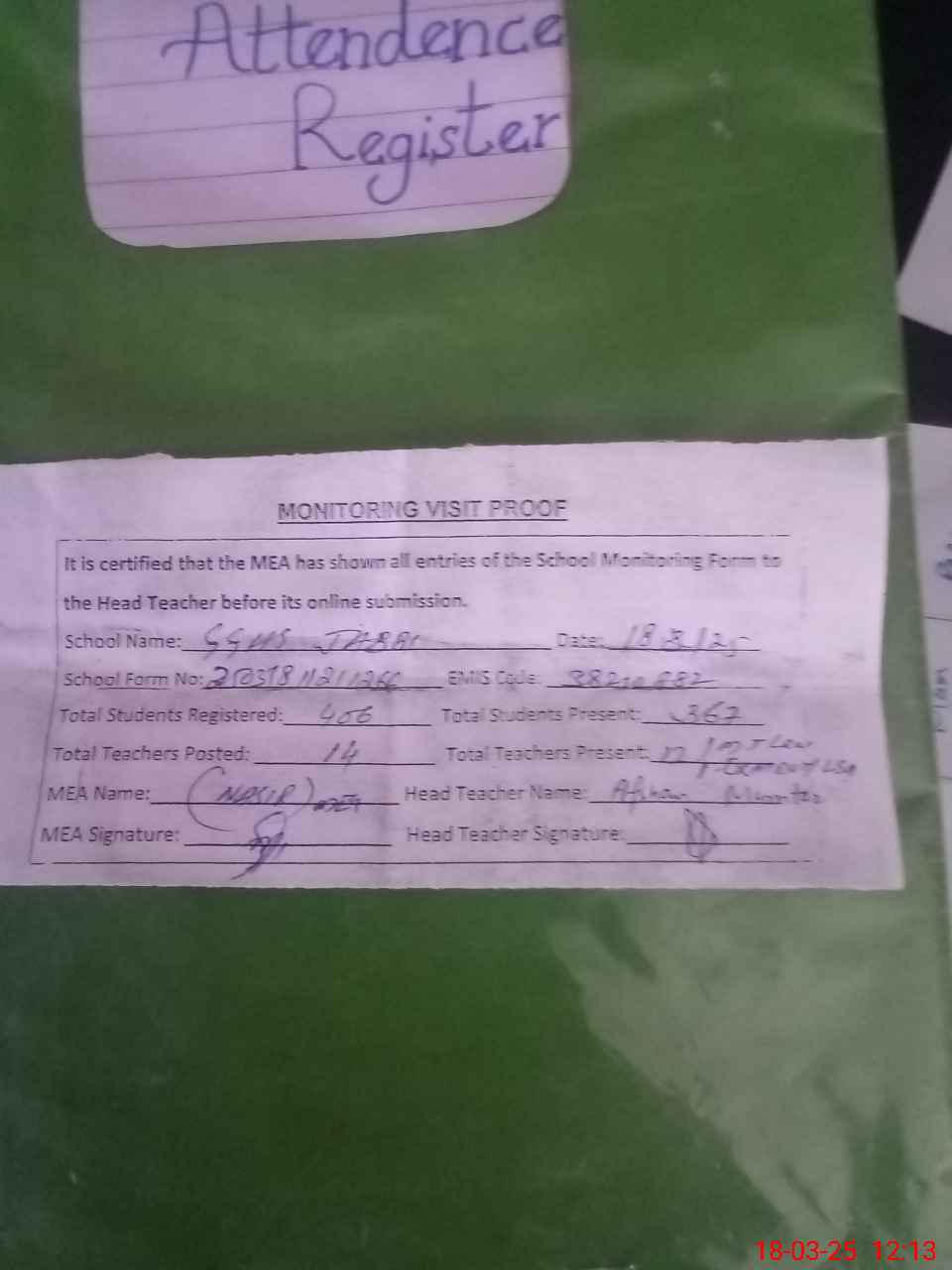 | Attendance Register | Head Teacher | MEA with School | Visit Proof |