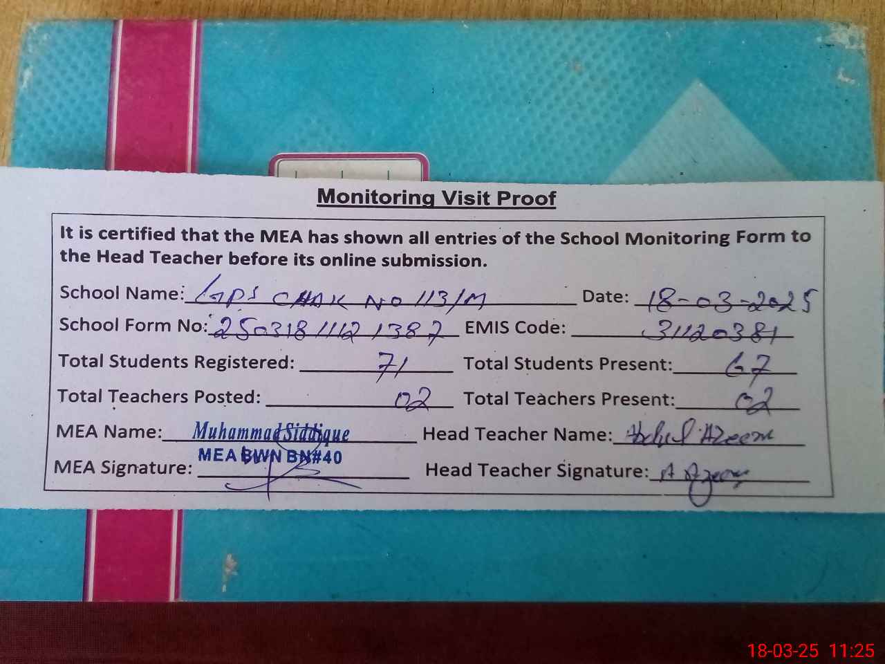 | EMIS Code: 31120381 | Name of School: GPS CHAK NO. 113 M | |||