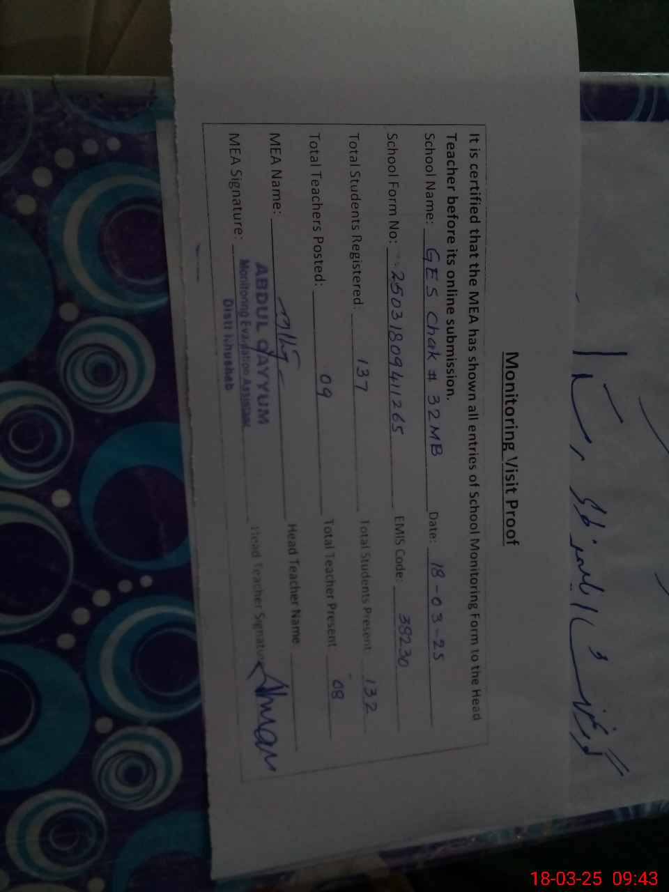 | EMIS Code: 38230836 | Name of School: GES CHAK NO. 32 MB | |||