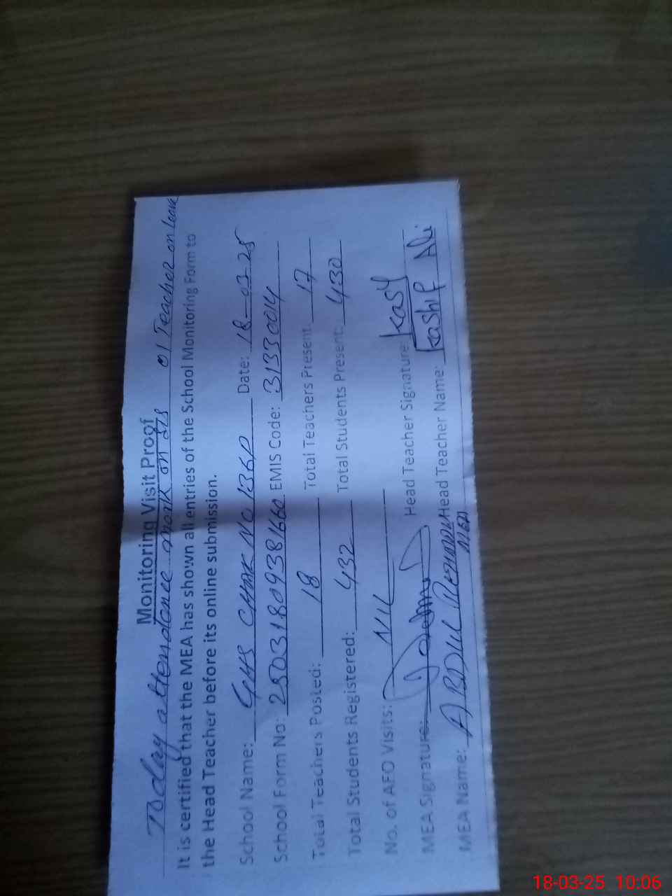 | Attendance Register | Head Teacher | MEA with School | Visit Proof |