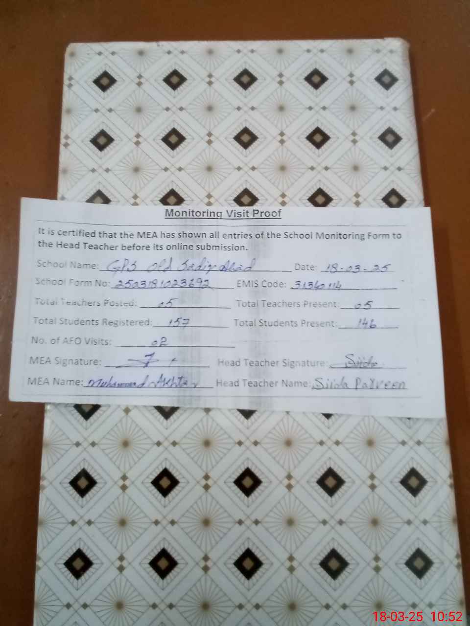 | Attendance Register | Head Teacher | MEA with School | Visit Proof |