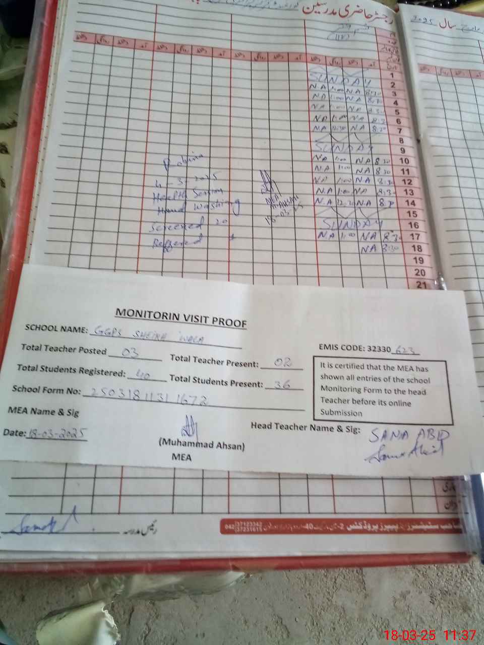 | Attendance Register | Head Teacher | MEA with School | Visit Proof |