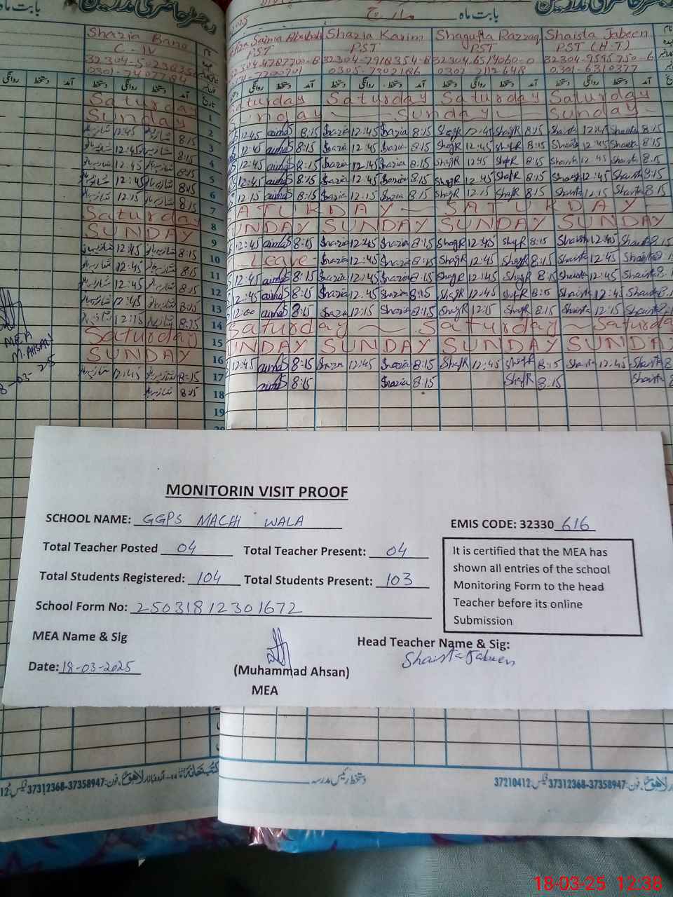 | Attendance Register | Head Teacher | MEA with School | Visit Proof |