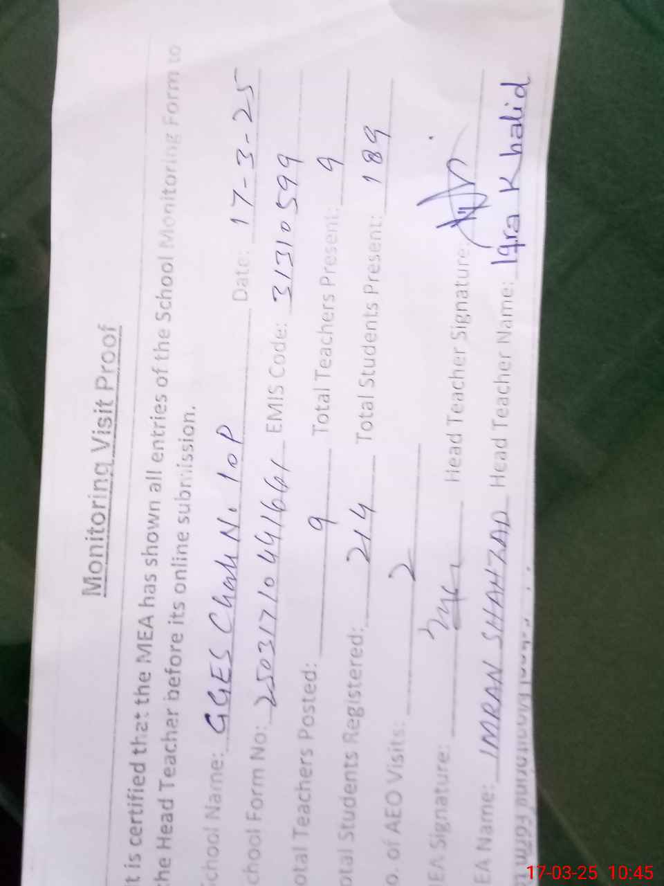 | Attendance Register | Head Teacher | MEA with School | Visit Proof |