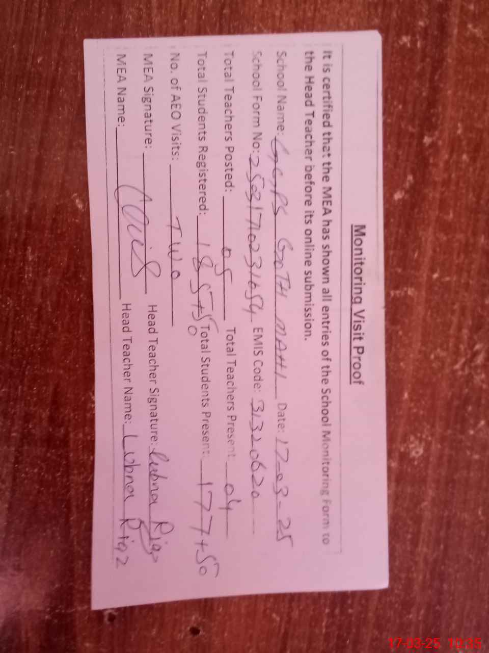 | Attendance Register | Head Teacher | MEA with School | Visit Proof |