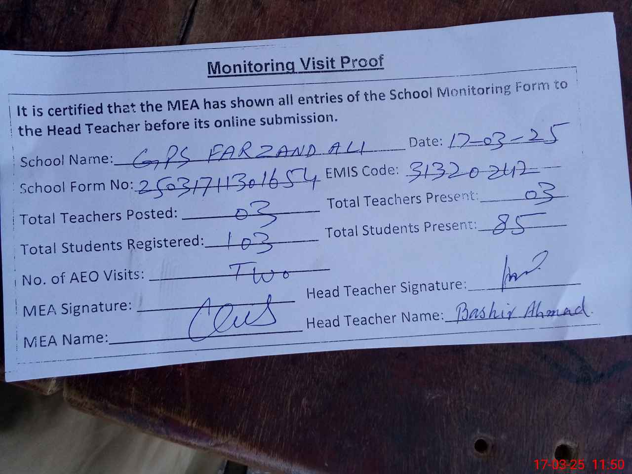 | Attendance Register | Head Teacher | MEA with School | Visit Proof |