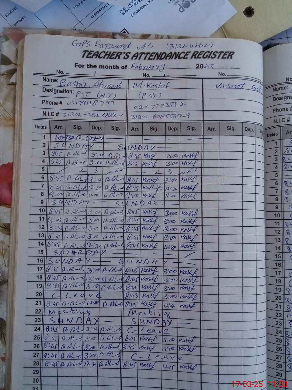 | Name: BA**** AH**** Designation: (School Headmaster's/Headmistress's) PST/PTC/JV Phone/Cell Number: 03**** |