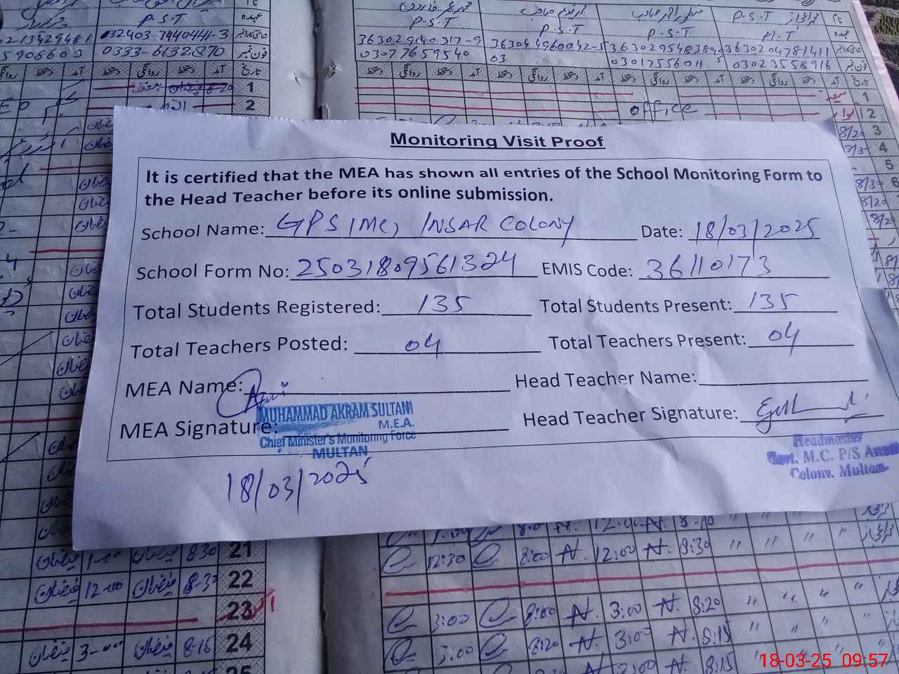 | Attendance Register | Head Teacher | MEA with School | Visit Proof |