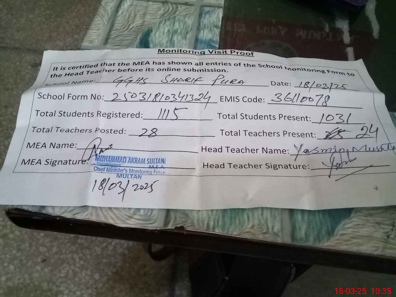 | EMIS Code: 36110078 | Name of School: GGHS SHARIF PURA MULTAN | |||