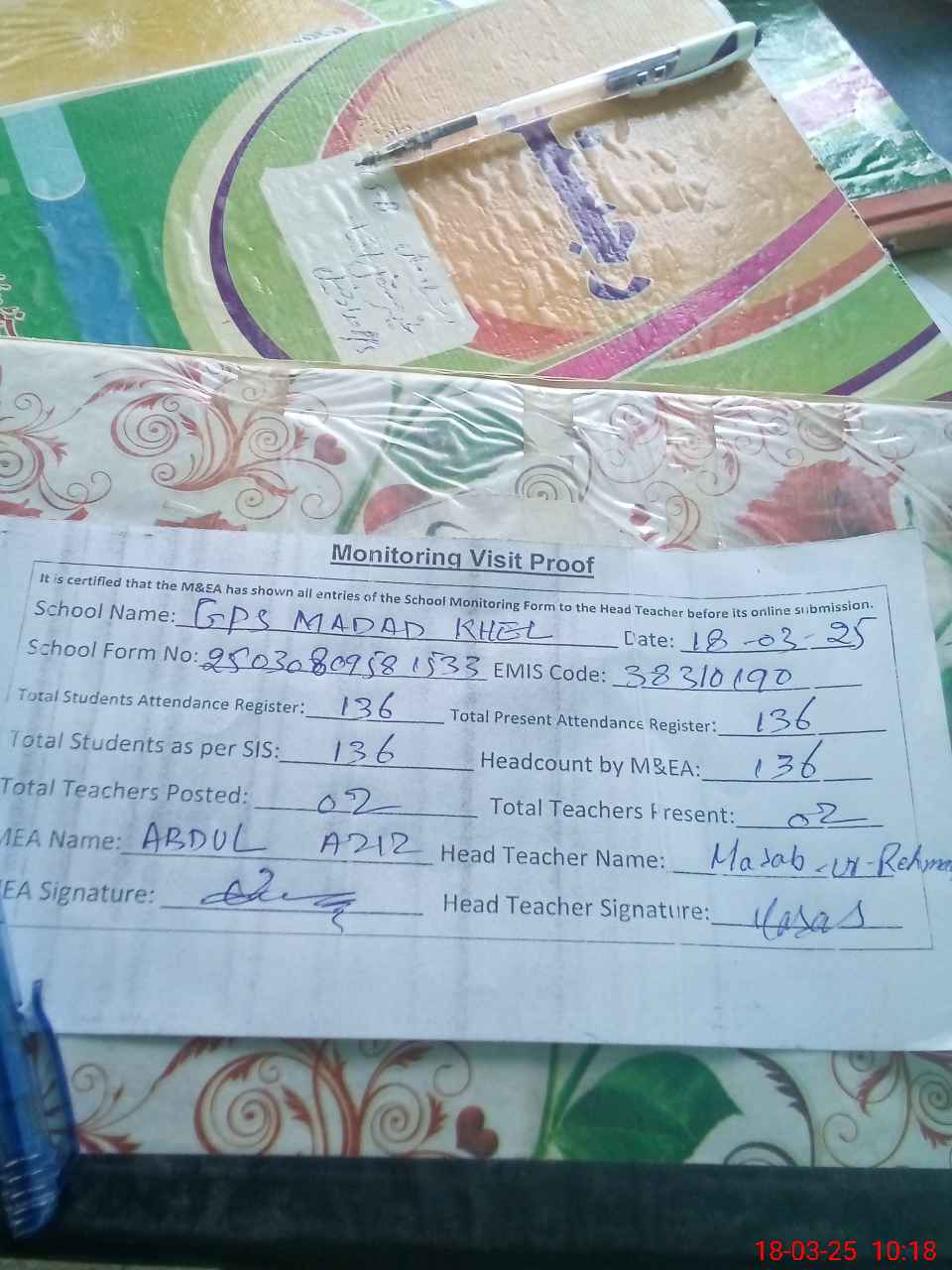 | Attendance Register | Head Teacher | MEA with School | Visit Proof |