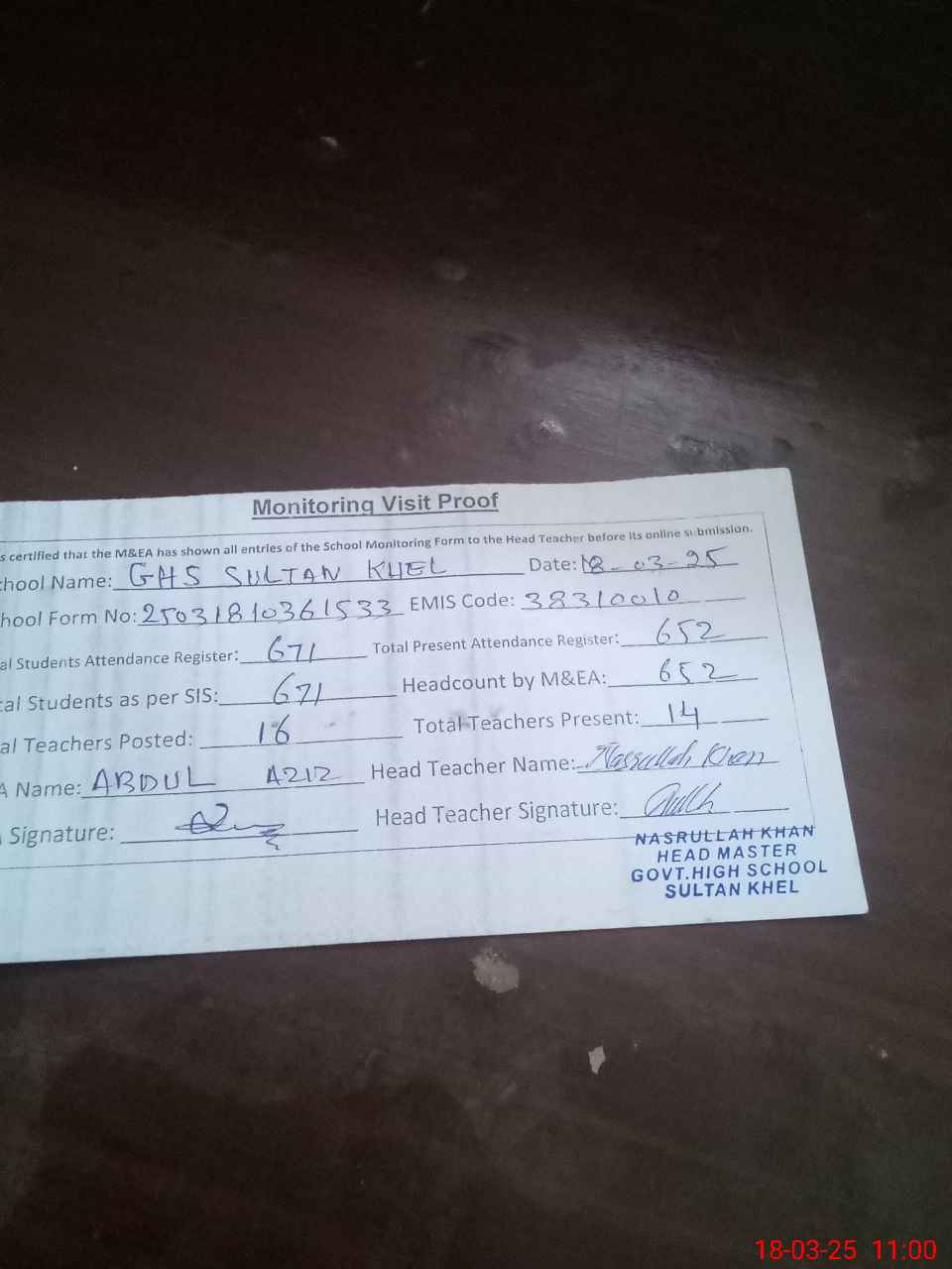 | Attendance Register | Head Teacher | MEA with School | Visit Proof |