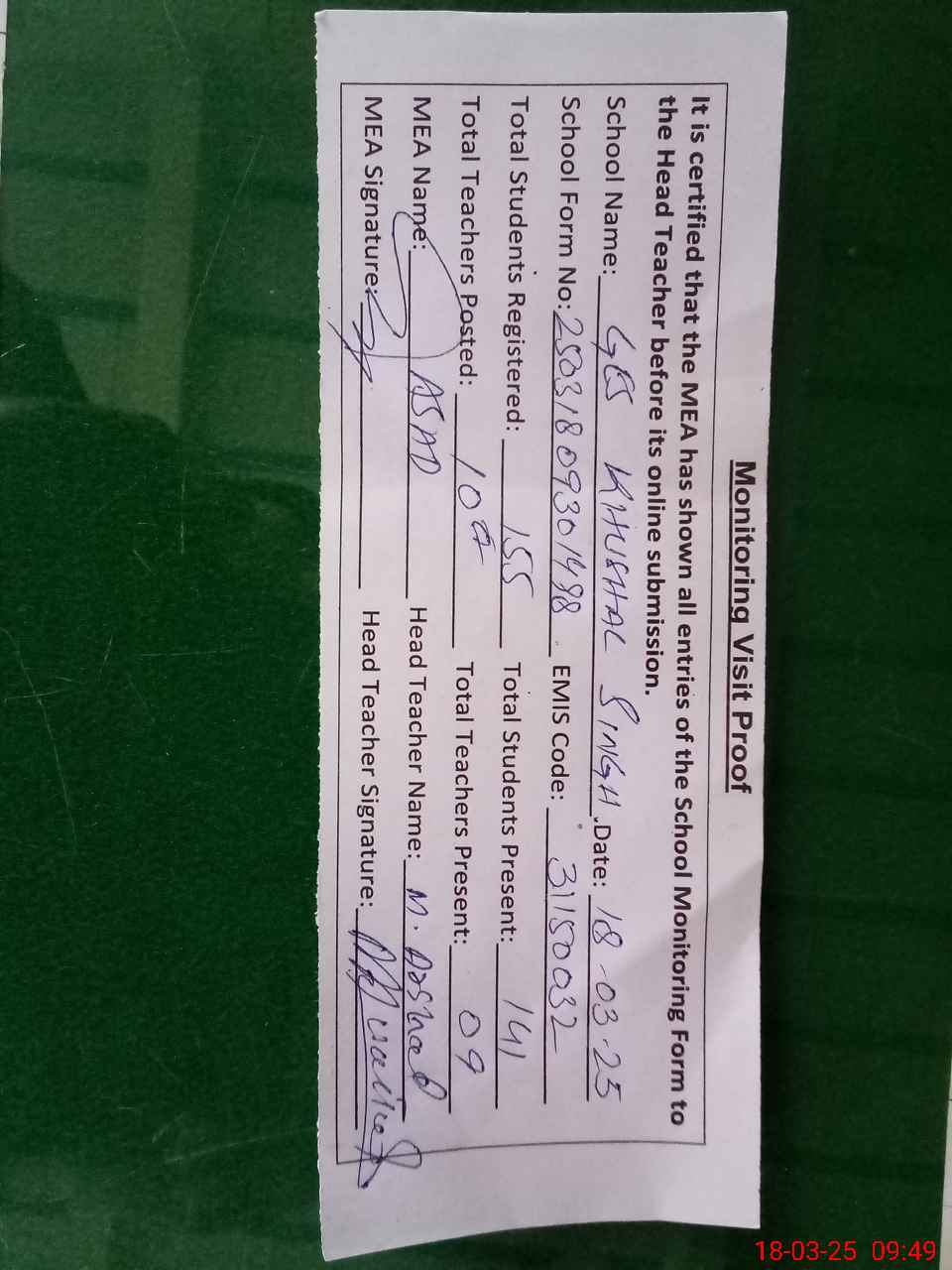 | Attendance Register | Head Teacher | MEA with School | Visit Proof |