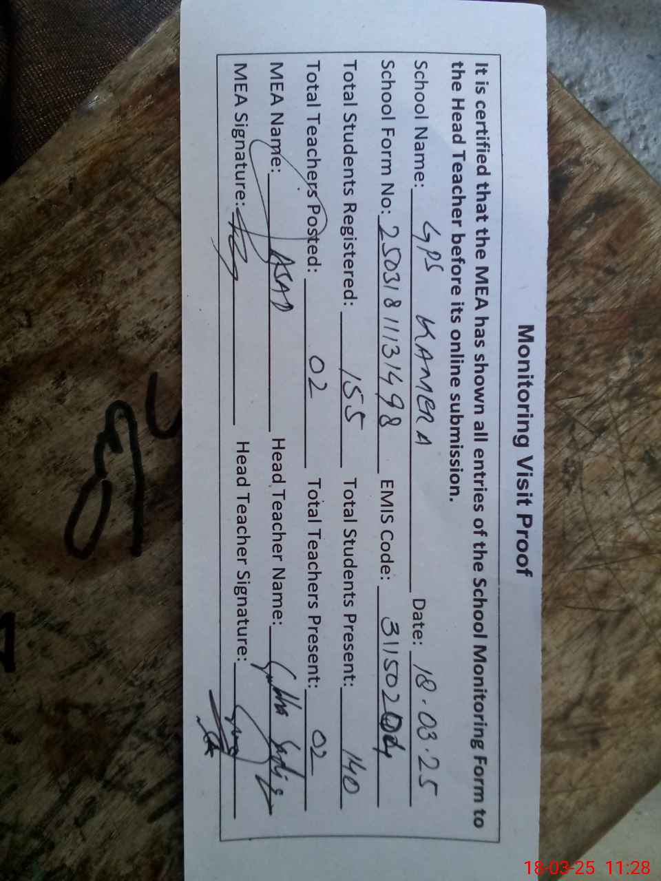 | Attendance Register | Head Teacher | MEA with School | Visit Proof |
