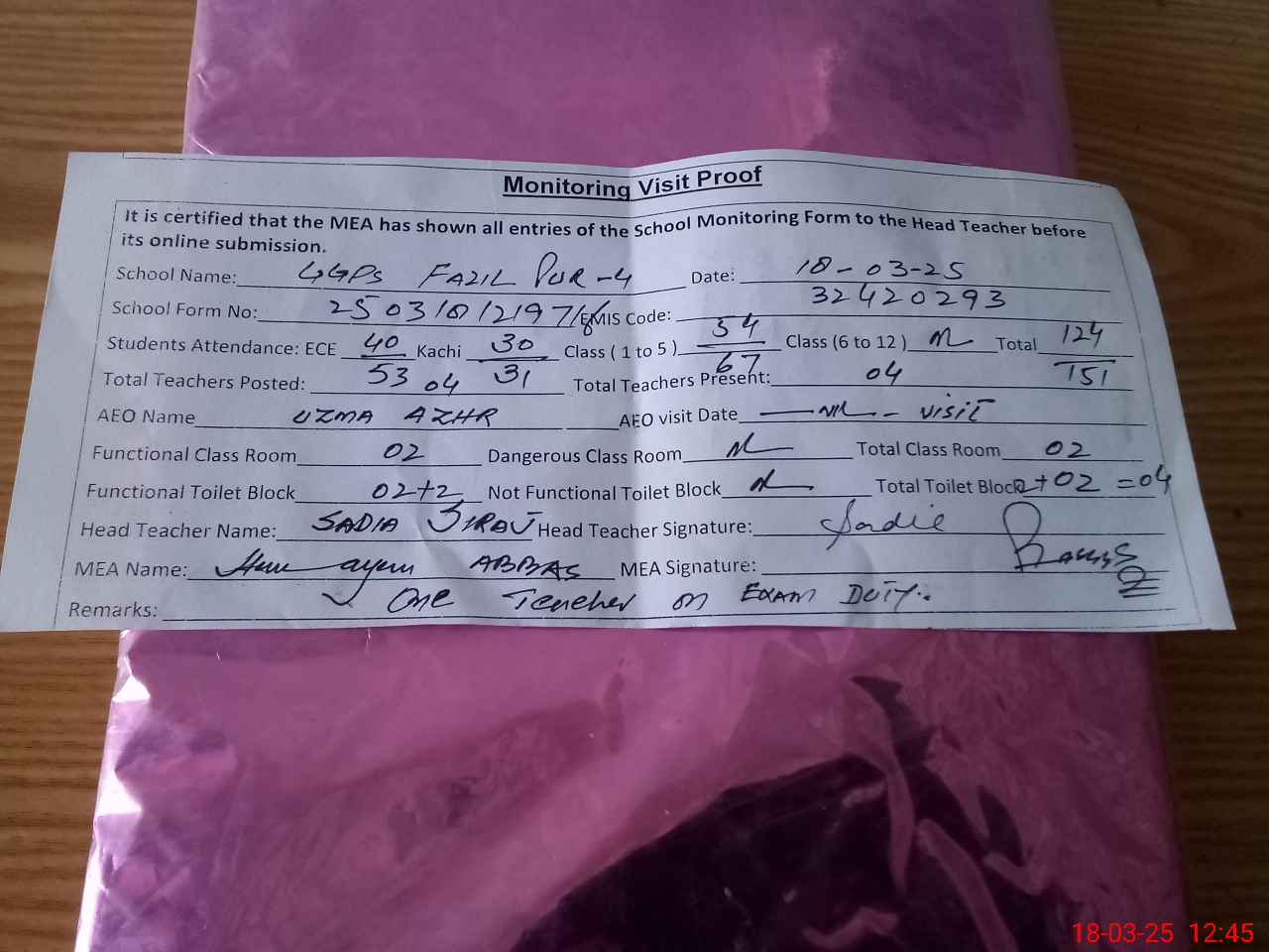 | EMIS Code: 32420293 | Name of School: GGPS FAZILPUR NO. 4 | |||