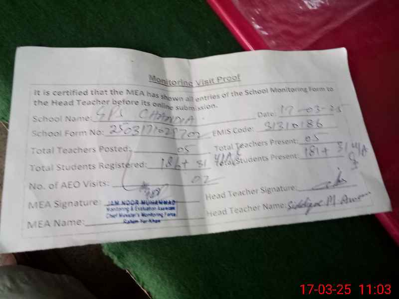 | EMIS Code: 31310186 | Name of School: GPS CHANDIA (After Noon) | |||