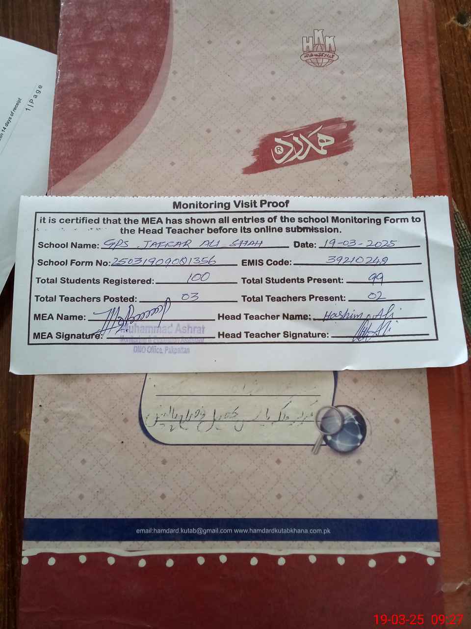 | Attendance Register | Head Teacher | MEA with School | Visit Proof |