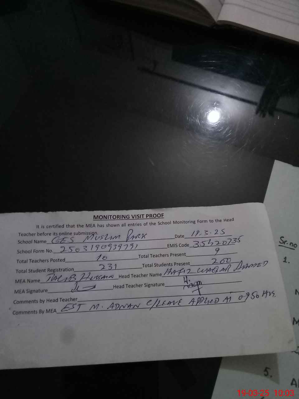 | Attendance Register | Head Teacher | MEA with School | Visit Proof |