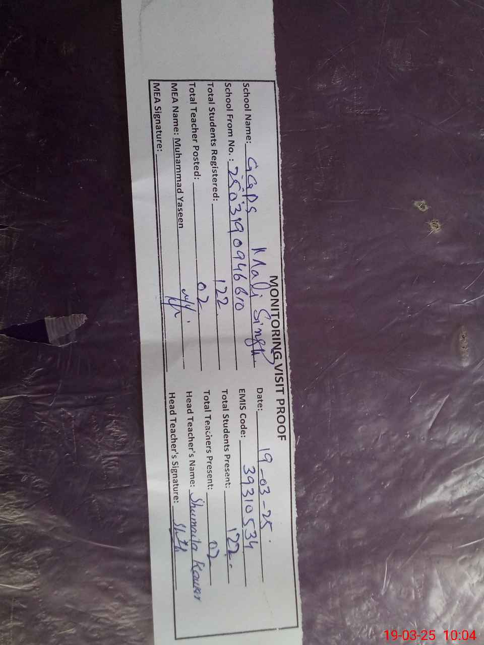 | Attendance Register | Head Teacher | MEA with School | Visit Proof |