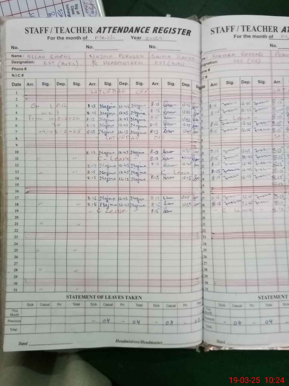 | Leave | Duty | Absent | Maternity | Medical | Ex- Pak |