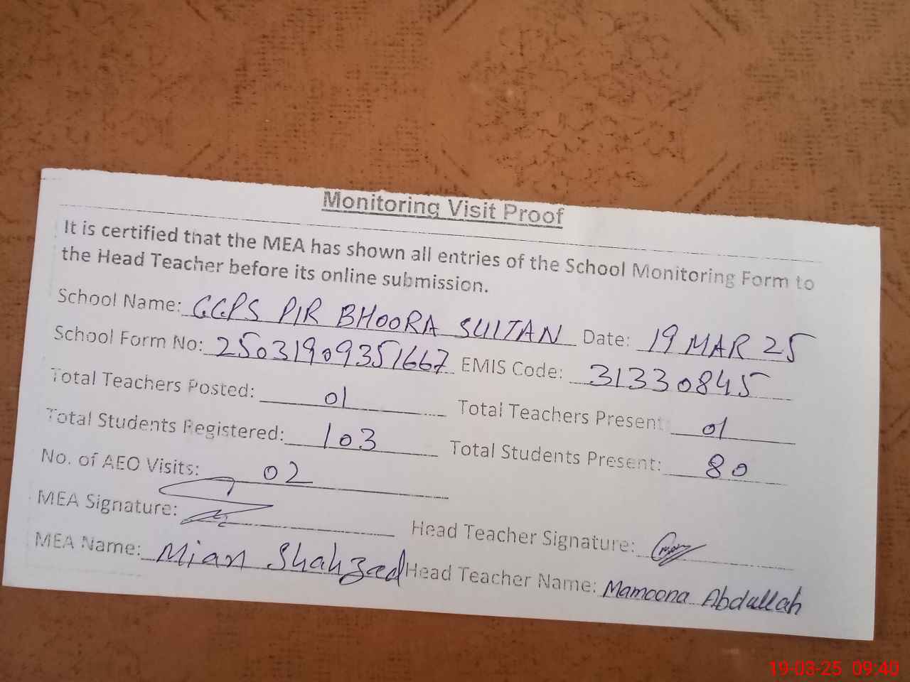 | Attendance Register | Head Teacher | MEA with School | Visit Proof |