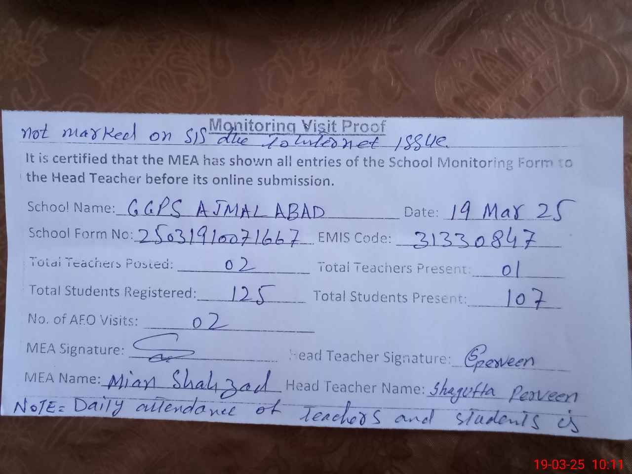 | Remarks (Use Separate Page if Required): Daily attendance of teachers and students is not marked on SIS due to internet issue | |||||