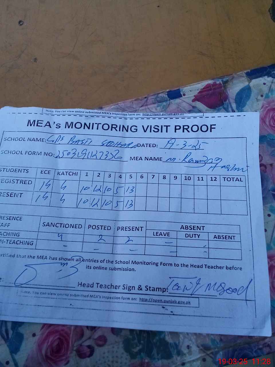 | Attendance Register | Head Teacher | MEA with School | Visit Proof |
