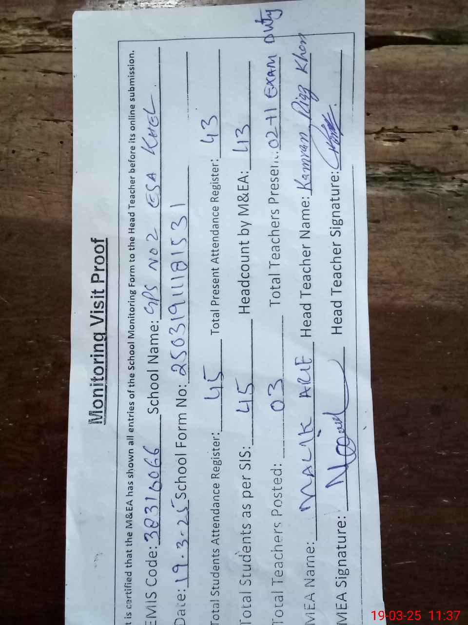 | Attendance Register | Head Teacher | MEA with School | Visit Proof |