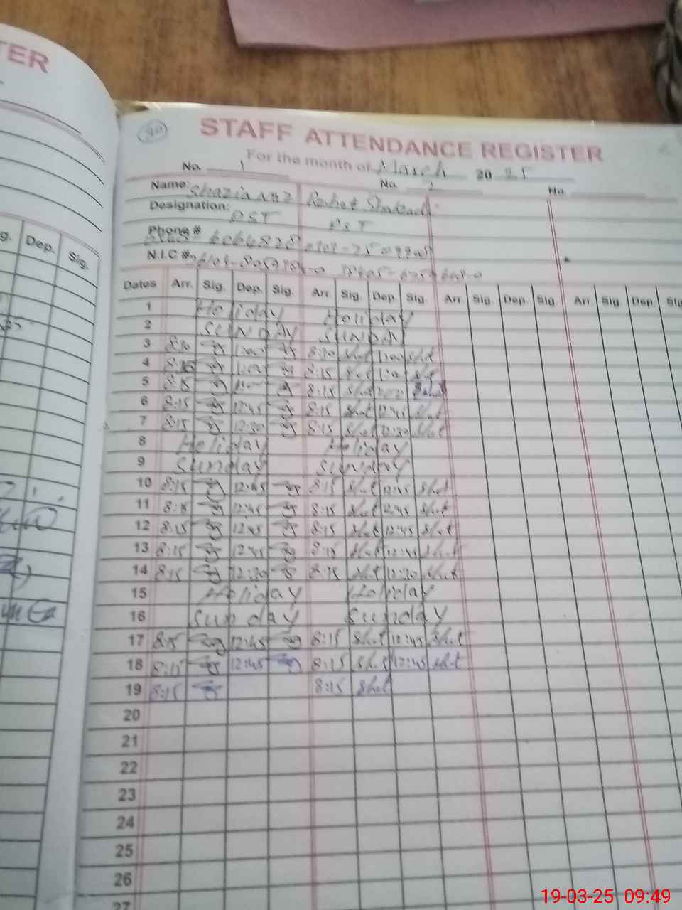 | Name: Sh**** Na**** Designation: (School Headmaster's/Headmistress's) PST Phone/Cell Number: 03**** |