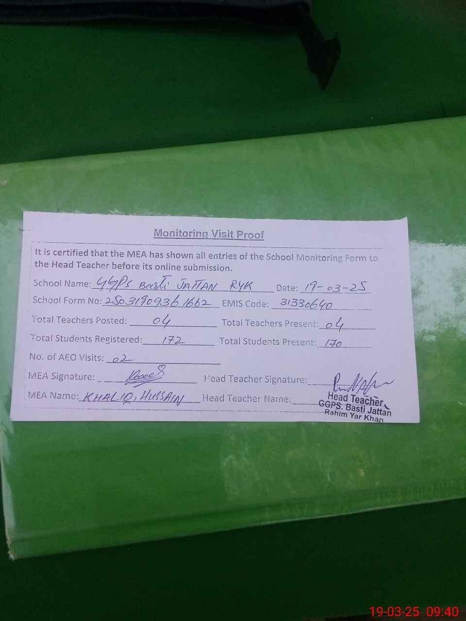 | EMIS Code: 31330640 | Name of School: GGPS BASTI JATTAN R.Y.KHAN (Basti Burra) | |||