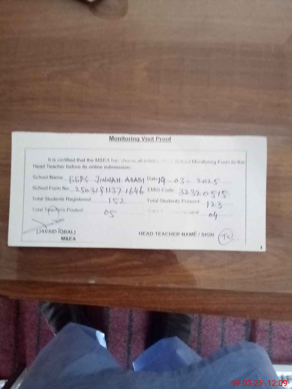 | Attendance Register | Head Teacher | MEA with School | Visit Proof |