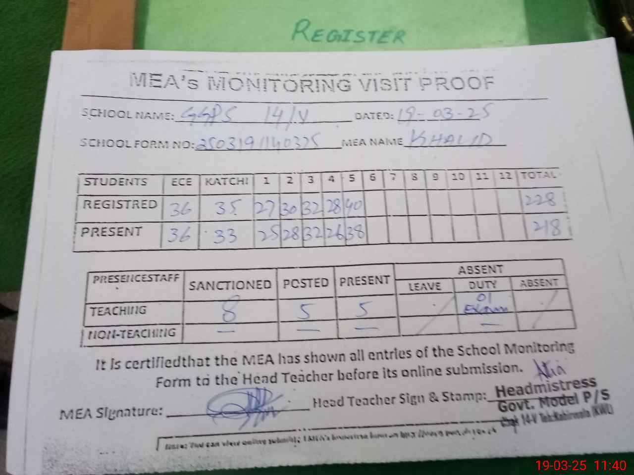 | Attendance Register | Head Teacher | MEA with School | Visit Proof |